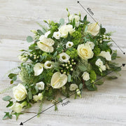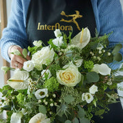 A lush blend of white and green featuring calla lilies, anthurim, and virburnum opulus. Ivy weaves elegantly through the teardrop shape.