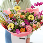 Ok, we’re out of bouquet territory and into works of floral art! This one will be a remarkable, bespoke display of stunning blooms, expertly arranged by our florist using the freshest, finest flowers they have available.This year our Mother’s Day designs are all about gorgeous pastels with pops of colour. Expect to see blooms in shades of baby pink, cream, and lemon with bursts of cerise and tangerine, and highlights of pale blue and lilac. They’ll be arranged so they’re on display, meaning they’ll wow as soon as they’re seen.