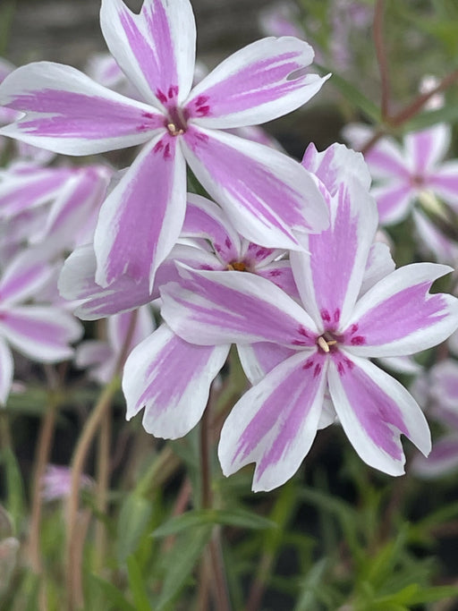 Phlox subulata 'Candy Stripes', commonly known as Creeping Phlox, is a charming, low-growing perennial that forms a dense mat of vibrant, varie...