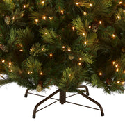 This Carolina Pine tree features mixed bristle and cashmere branch tips and is trimmed with flocked pine cones. It is pre-strung with 750 clear lights that remain lit even if a bulb burns out. This three section tree features hinged branches for ease of assembly. Sturdy folding metal tree stand is included.