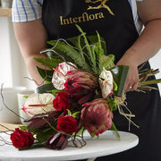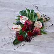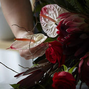 Vibrant blooms, including red roses and white anthuriums, meets rich foliage including a monstera leaf and umbrella fern.