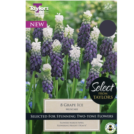 Muscari 'Grape Ice', a unique variety of grape hyacinth, stands out with its striking bi-colored flowers. The blooms feature deep purple bases topp...