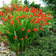 Crocosmia 'Lucifer' is a beautiful perennial plant with tall, arching spikes of vibrant red flowers. Native to South Africa, it is a popular garden plant in many regions around the world. The plant produces sword-shaped leaves that form dense clumps, from which the striking red flowers emerge in mid to late summer. The flowers are tubular and have six petals, with long stamens that protrude out of the flower. They attract hummingbirds and other pollinators to the garden.