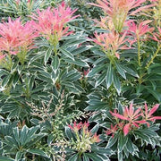 Pieris japonica ‘Flaming Silver’ is an ornamental evergreen shrub valued for its striking foliage and delicate, cascading flowers. New growth emerges with vibrant pink and red hues that gradually mature to silver-green, creating a dynamic display throughout the growing season. Its elegant, urn-shaped white flowers in spring add charm to sheltered garden beds, borders, or containers.