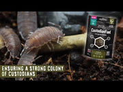 For those small species, including dart frogs and recently metamorphosed frogs and toads, springtails are also an excellent food source. For other reptiles, including leopard geckos and young bearded dragons or bosc monitors to name a few, the larger custodians are also a supply of food. When consumed custodians become a welcome addition to a varied reptile or amphibian diet. As such, CustodianFuel can also be thought of as a gutloading food, as it will boost the nutritious quality of these invertebrates.
