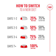 The transition of your cat from one food to another should be slow and gradual over a period of 7 to 10 days. Please refer to the feeding guidelines on the package to ensure proper rationing.