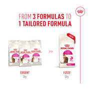 To offer picky cats meals with maximum taste, the Fussy formula combines our 3 previous Exigent formulas – Savour, Aroma, and Protein – into one product: ROYAL CANIN® Fussy.
