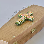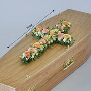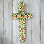 A cross of pretty pastels including peach roses and germini, white carnations and cream lisianthus.