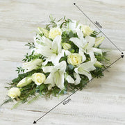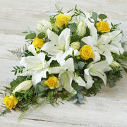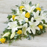 An elegant tear drop shaped arrangement featuring delicate foliage and large fragrant oriental lilies, combined with gorgeous roses.