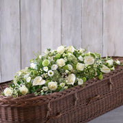 A beautiful casket spray in classic green and white colours, with the finest roses, calla lilies, anthurium and viburnum opulus.