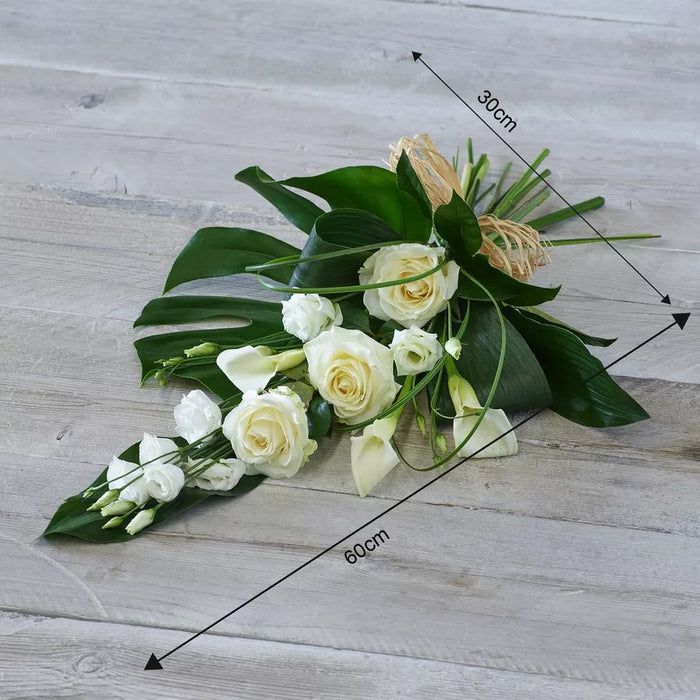 Graceful calla lilies meet large headed roses and rich green foliage in an elegant, neutral design.