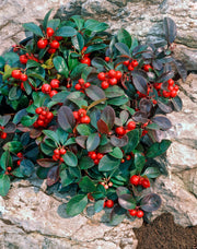 Gaultheria procumbens (Wintergreen) is a low-growing, evergreen shrub prized for its glossy, leathery leaves, fragrant white to pale pink bell-shaped flowers, and bright red berries that persist through winter. Its aromatic foliage often turns bronze-red in colder months, adding seasonal interest. Ideal for groundcover in shady borders, woodland gardens, or containers, this hardy plant brings year-round colour and texture.