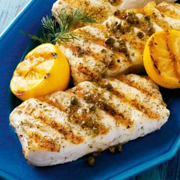 Halibut with Grill Roasted Lemon & Caper Dressing