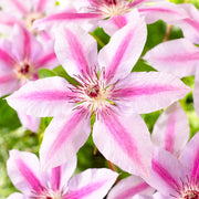 Clematis 'Nelly Moser' is a popular deciduous climber with large, showy flowers that bloom from late spring to early autumn. The flowers are a distinctive mauve-pink color with a prominent central stripe of lighter pink. This clematis is suitable for growing in Irish gardens and can thrive in full sun to partial shade with well-draining soil. The vine can reach a height of up to 3m, making it perfect for adding height to a garden.