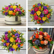 • An easy-to-care for arrangement of flowers in a chic hatbox