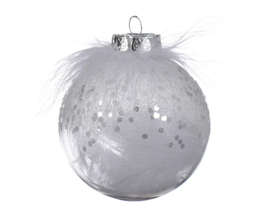 Elevate your holiday decor with our Shatterproof Bauble adorned with White Feathers. Measuring 8cm, this elegant ornament shimmers in silver, captu...