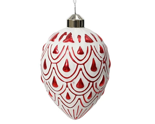 Bauble Shaped Pinecone, an exquisite glass ornament in a rich oxblood and white color. Hang it with care to infuse your space with a sense of elega...
