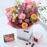 A exquisite bouquet PLUS gourmet chocolates PLUS a lovely full sized card – after all, mum deserves it. Treat mum to a beautiful Mother’s Day bouquet, expertly arranged by our florist. They’ll choose the freshest blooms to suit the occasion, arrange them exquisitely so they’re on show – and wow from the moment they arrive. This year our Mother’s Day designs are all about gorgeous pastels with pops of colour. Expect to see blooms in shades of baby pink, cream, and lemon with bursts of cerise and tangerine, and highlights of pale blue and lilac.