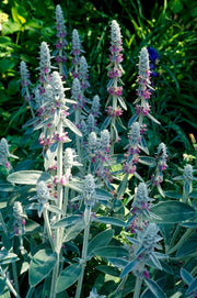 Stachys byzantina, commonly known as Lamb's Ear, is a beloved perennial recognized for its silvery, soft, and fuzzy leaves that feel akin to a lamb's ear. This low-growing plant not only serves as a delightful ground cover, adding a tactile and visual appeal to gardens, but also produces tall spikes of small, purplish-pink flowers in early to mid-summer. Its unique foliage texture and understated floral display make it a versatile choice for borders, rock gardens, or containers.