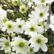 Clematis 'Early Sensation' is a prized evergreen cultivar known for its vibrant, creamy-white blooms that burst forth in early spring. This Clematis variety is unique for its ability to provide early-season flowers, long before many other plants awaken from winter dormancy. Amidst the backdrop of its leathery, dark green leaves, the delicate blossoms of 'Early Sensation' truly stand out, heralding the arrival of warmer days.