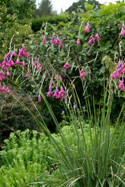 Dierama pulcherrimum, commonly known as Angel’s Fishing Rod, is an elegant perennial renowned for its arching, grass-like stems and delicate, bell-shaped pink to mauve flowers that nod gracefully in the breeze. Blooming in summer, it adds movement and a soft, airy texture to borders, meadows, and naturalistic plantings. Hardy yet graceful, Dierama pulcherrimum thrives in well-drained soil and sunny positions, making it a favourite for adding vertical interest and subtle colour to cottage or wildlife gardens.