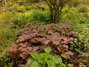 Rodgersia 'Braunlaub' is a bold and striking perennial known for its impressive foliage and attractive blooms. This plant features large, palmate leaves with a bronze-brown tint, which deepen in color as the season progresses, providing a rich, textured backdrop in the garden. During summer, tall flower spikes emerge, bearing clusters of creamy white to pinkish flowers that add vertical interest and attract pollinators like bees and butterflies. 'Braunlaub' thrives in moist, shaded locations, making it an excellent choice for woodland gardens, alongside ponds, or in shaded borders where its dramatic foliage and flowers can shine.