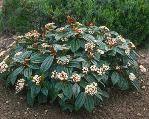 Viburnum tinus is an evergreen shrub valued for its dense, glossy foliage and clusters of small, fragrant flowers that appear in late winter to ear...