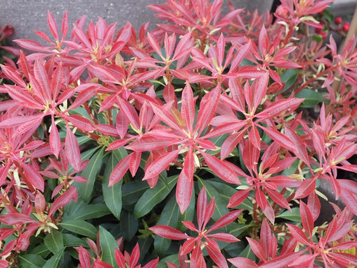 Pieris japonica 'Mountain Fire' is an enchanting evergreen shrub renowned for its fiery red new growth that creates a striking contrast against the...