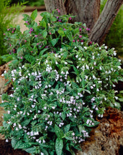Pulmonaria 'Sissinghurst White' is a beautiful, low-growing perennial that produces clusters of elegant white flowers, which are borne on upright stems above the attractive, spotted foliage. This cultivar of lungwort is known for its clean, white blooms that gradually fade to blue as they mature, offering a striking contrast against its silver-spotted green leaves. It thrives in shaded or woodland gardens, adding early spring interest and providing valuable nectar for pollinators. 'Sissinghurst White' is a perfect choice for adding texture and colour to shady areas or moist, well-drained soil.