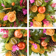 A quick rundown: a vivid, colourful wreath made using vibrant fresh flowers and foliage expertly chosen and arranged by our florist.