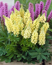Lupin Gallery Yellow is a herbaceous perennial plant that is native to the North America region. It features tall flower spikes that are covered with a profusion of vibrant yellow blooms, creating a stunning display in any garden. The plant is also known for its attractive foliage, which consists of large, deeply lobed leaves that provide a beautiful backdrop for the bright flowers.