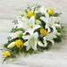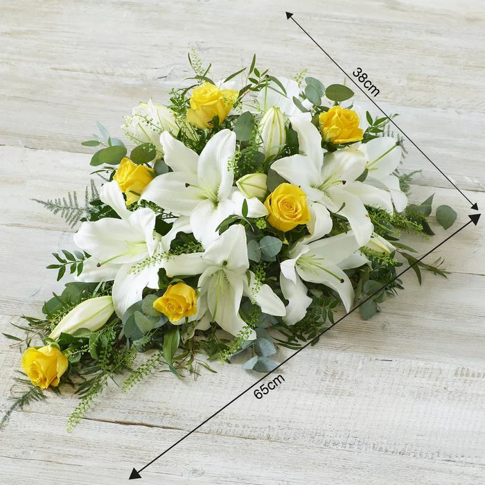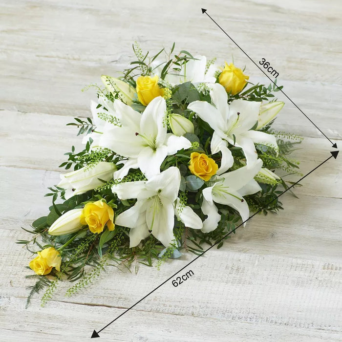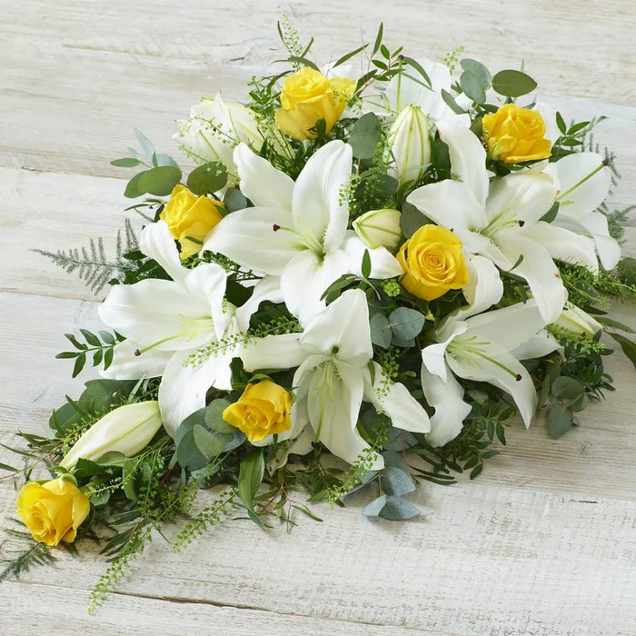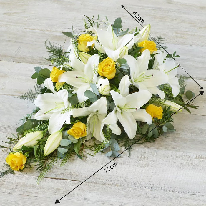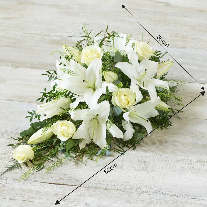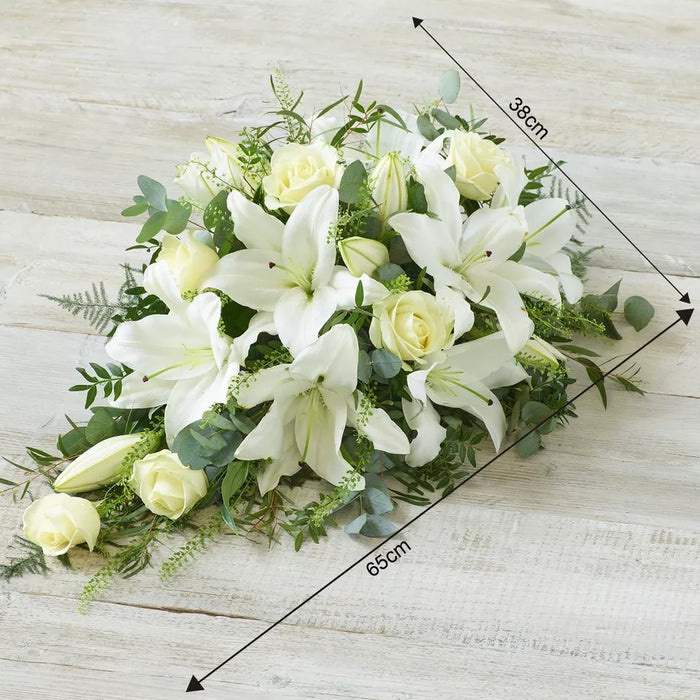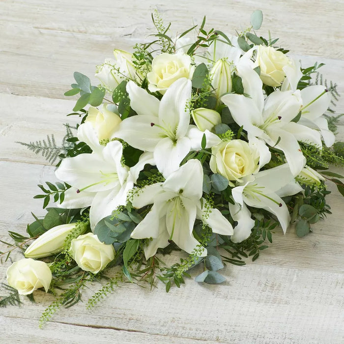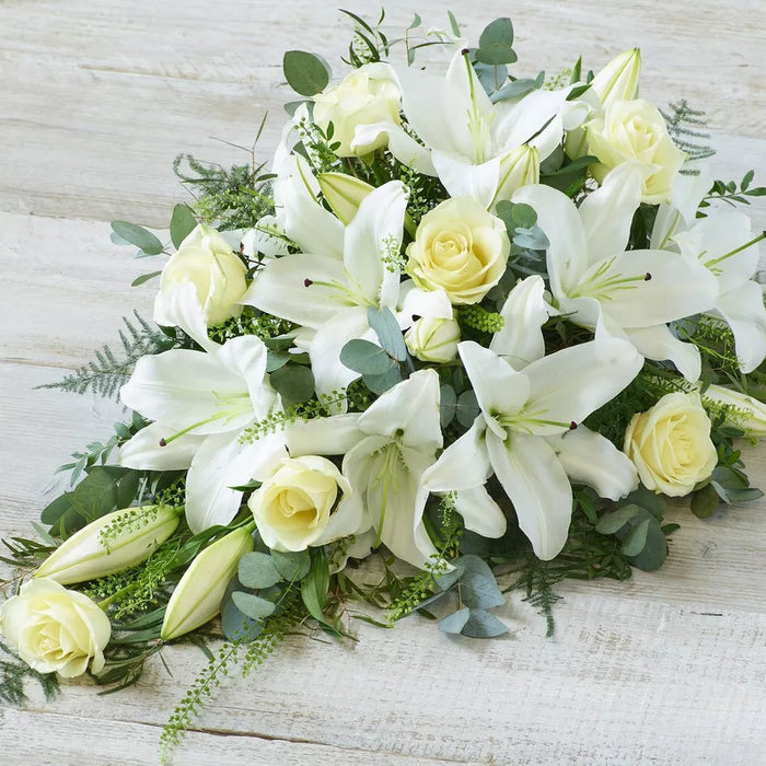 An elegant tear drop shaped arrangement featuring delicate foliage and large fragrant oriental lilies, combined with gorgeous roses.