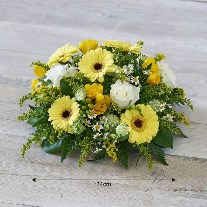 A pretty combination of fresh yellow and white blooms featuring germini, astrantia and fragrant freesias.