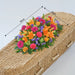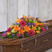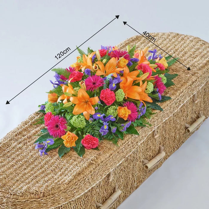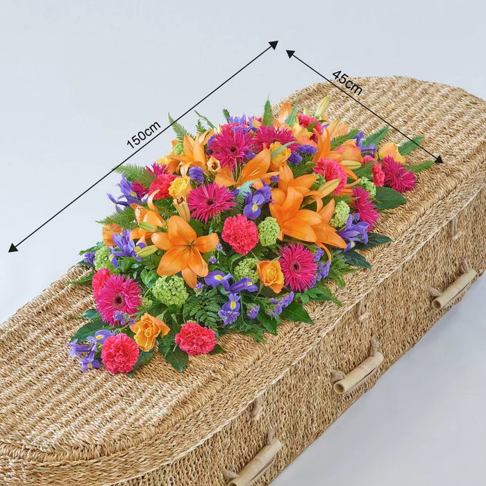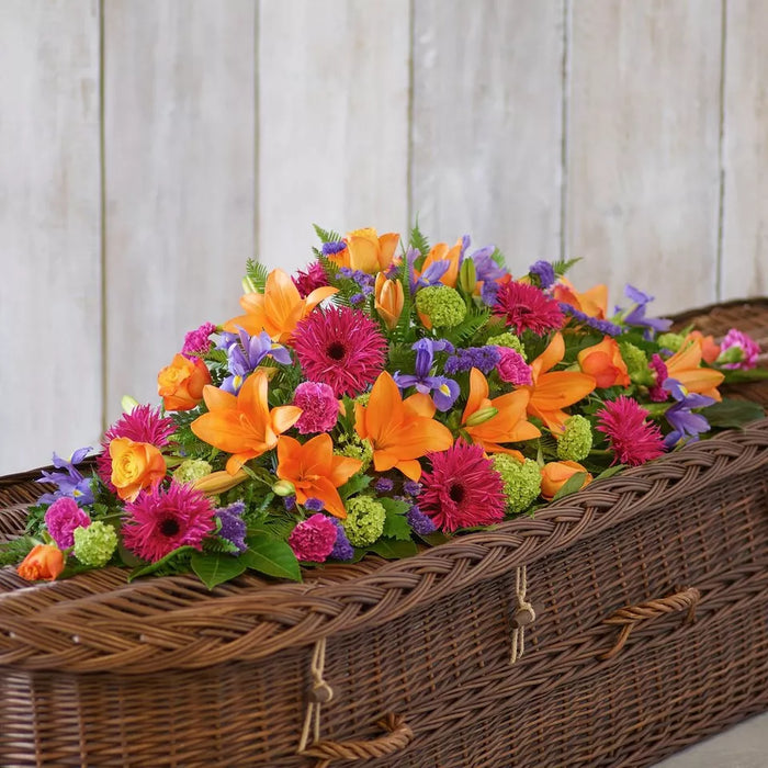 A casket spray of beautifully bright blooms including cerise carnations, orange roses and striking orange lilies.
